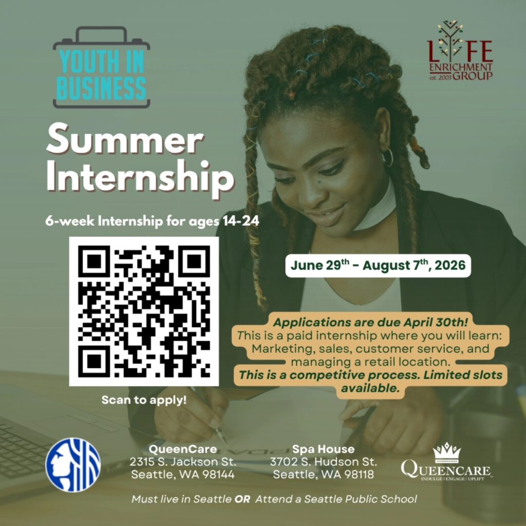 Youth in Business offers an internship to young people, ages 14 -24, who live in the city of Seattle or attend Seattle Public Schools. Slots are limited for this paid internship.