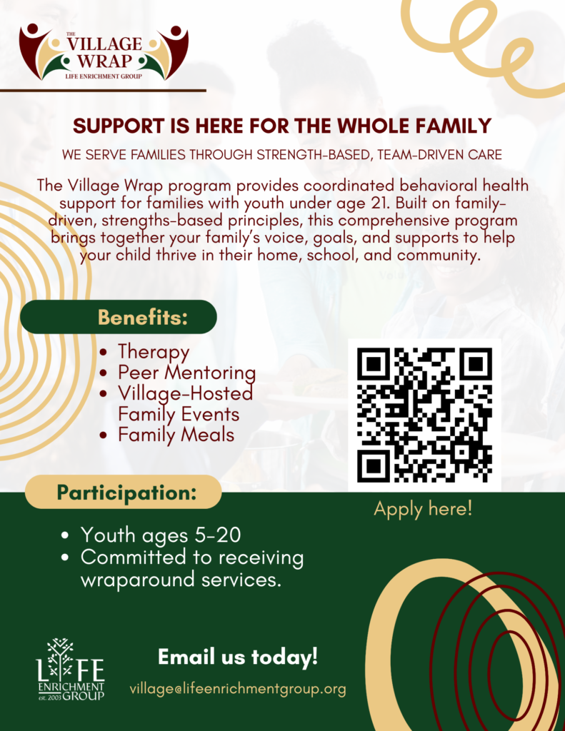 The Village Wrap program provides coordinated behavioral health support for families with youth under age 21. Built on family-driven, strengths-based principles, this comprehensive program brings together your family’s voice, goals, and supports to help your child thrive in their home, school, and community.